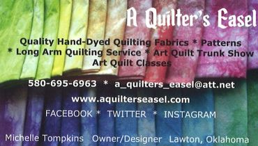 Michelle Tompkins will bring her lovely high quality hand dyed fabrics available in a variety of tints of the same color. If you've ever learned about color theory, you'll appreciate having these hand dyed fabrics available to use tints of a certain color for your quilting and fiber arts projects. Michelle also makes custom quilts, offers longarming quilting services, and lectures with trunk shows for quilt guilds.