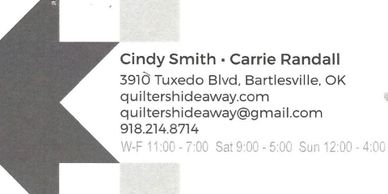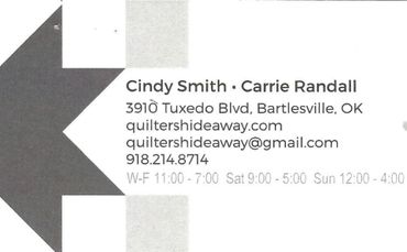 We are so pleased that Quilter's Hideaway in Bartlesville will be at our quilt show in Sept. They have such a cute shop and also offer longarm quiltinging services. Come to our show and see what they have to offer!