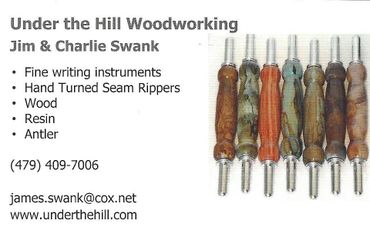 Under the Hill Woodworking has some items quilters will appreciate - a chain piecing cutter and seam rippers. The chain piecing cutter is mounted in a block of wood and is as easy to use as it is beautiful to look at. The cutting piece can be stored in the block for when you want to take it on retreat. Their seam rippers have the most gorgeous handles made of natural or dyed wood or resin. It'll make you not dread ripping those seems as much! They also offer pens, crosses, ornaments, and jewelry.