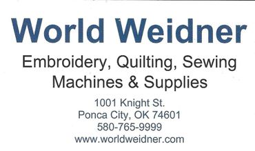 In addition, World Weidner will also be a vendor at the show. They are proud to distribute Brother, Janome, Melco, Eversewn and Bernette Embroidery, Sewing, and Quilting Machines and Supplies as well as Siser Heat Transfer Vinyls and Craft Vinyls in Northern Oklahoma and Southern Kansas. They also sell a full line of Threads, Bobbins, Stabilizers, Needles, Designs, Software, Cabinets, Notions,