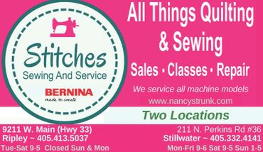 Stitches is your source for all things Bernina, quilting, and machine service and repair. They offer Bernina domestic and embroidery machines and Prosumer longarm lines in Ripley, and Pfaff and Singer in Tulsa. Their service department is trained to service and repair all brands of machines.