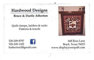 Hardwood Designs will be bringing their beautiful spring-loaded wood quilt clamps that make quilts easier to hang. There are no knobs to turn and an inside strip protects the quilt fabrics. Have a wide quilt? No problem, they use springs with extra tension for wider quilts. They also have nice wood quilt ladders and racks! All products are built to your specifications and come in a variety of sizes and stains.