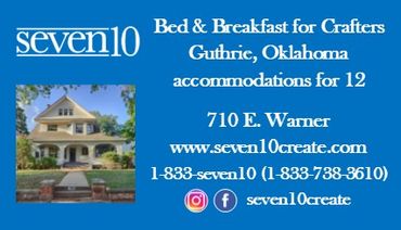 Seven10 create is a bed and breakfast in a lovely restored home in historical Guthrie that caters to quilters and crafters. They think of everything to keep makers focused on making - all the amenities of your craft room at home and plenty of yummy food to get you back to making. And all the beds have adorable quilts!! When you come to our show, visit their booth and learn how you can schedule your weekend retreat!